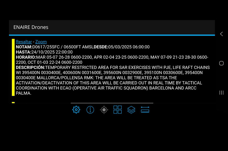 Important: The map (ENAIRE Drones) colours the areas to make them easier to read (green/yellow/red), but this colour is only a visual aid, not the NOTAM itself. Red = do not fly without permission; yellow = caution; green = generally free.